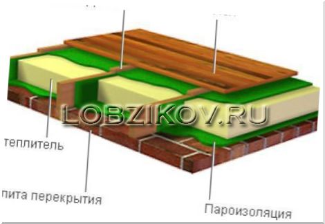 ... между половыми лагами (балками) по черному полу (потолку), изолирую ут-